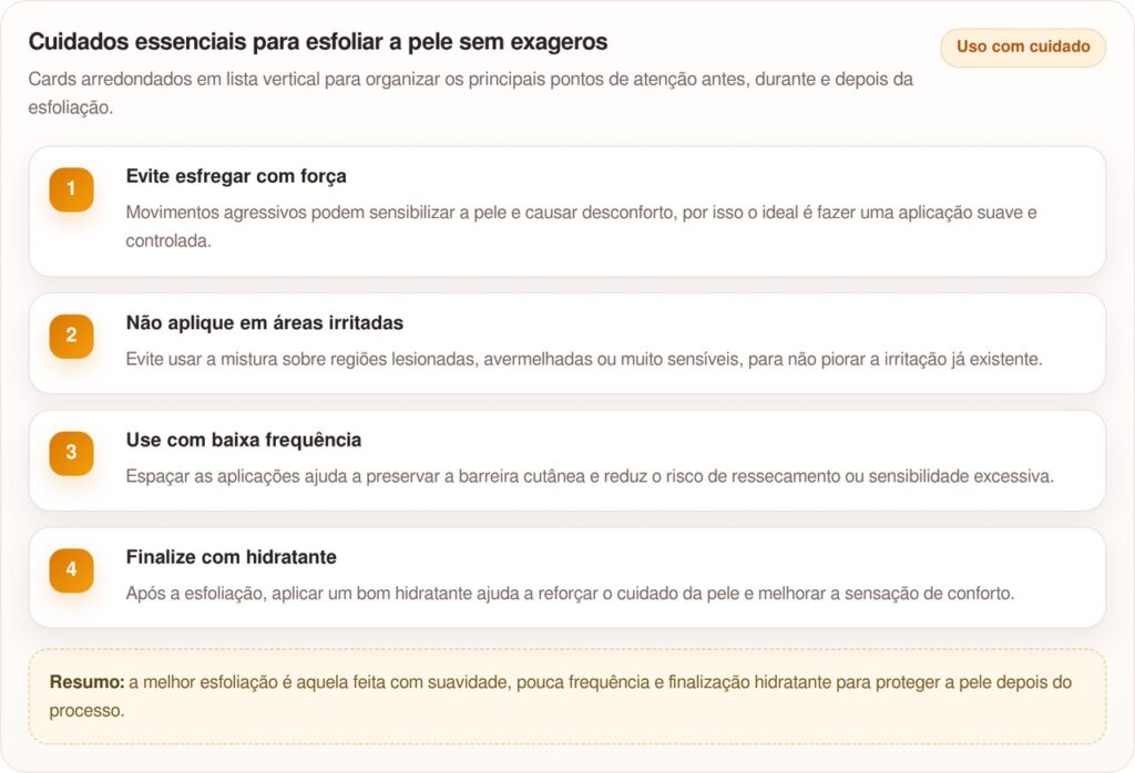 Mesmo sendo um truque caseiro bastante conhecido, a esfoliação deve ser feita com moderação. O excesso pode sensibilizar a pele, causar vermelhidão e comprometer a barreira cutânea, o que vai na direção contrária de uma rotina de beleza saudável.