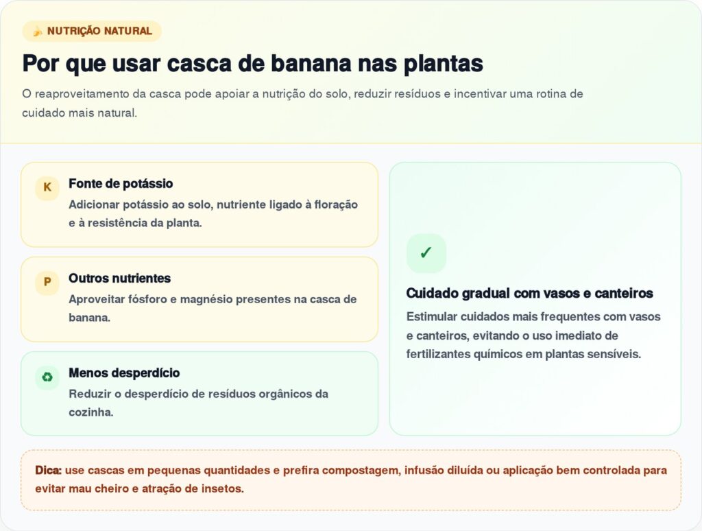 A casca de banana contém elementos importantes para floração, enraizamento e desenvolvimento das plantas. O vinagre, quando usado com cuidado e diluído, pode ajudar no preparo da mistura, mas não deve ser aplicado puro na terra nem nas folhas.