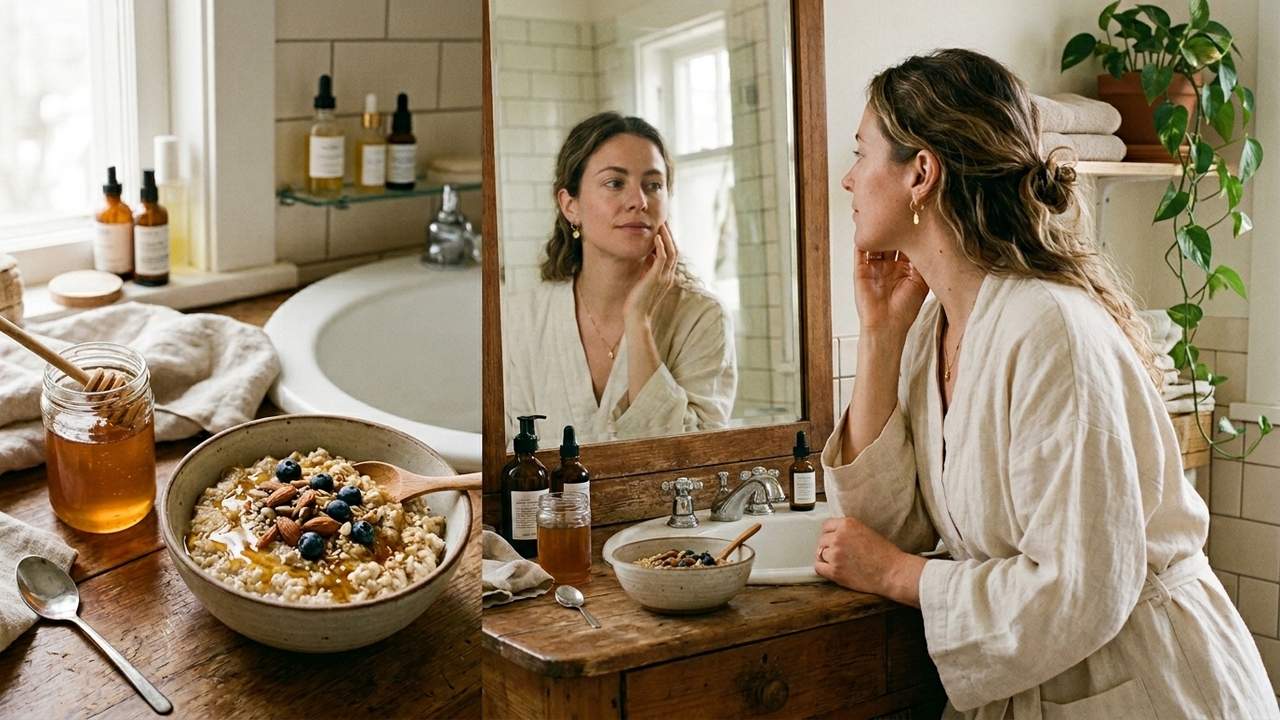 mel forma uma película leve que ajuda a manter a umidade por mais tempo, enquanto a aveia, em flocos finos ou farinha, oferece esfoliação mecânica delicada. A aveia também é ligada a propriedades calmantes e anti inflamatórias, que podem reduzir vermelhidão leve e proporcionar conforto em peles sensíveis ou ressecadas.