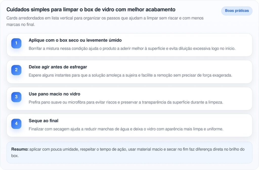 O principal motivo é a praticidade. Em vez de espalhar vários produtos diferentes, a pessoa usa uma solução simples, aplica diretamente no box e deixa agir por alguns minutos antes de esfregar. Isso reduz o esforço inicial e ajuda a distribuir melhor o produto em áreas amplas, como portas de vidro e painéis fixos.