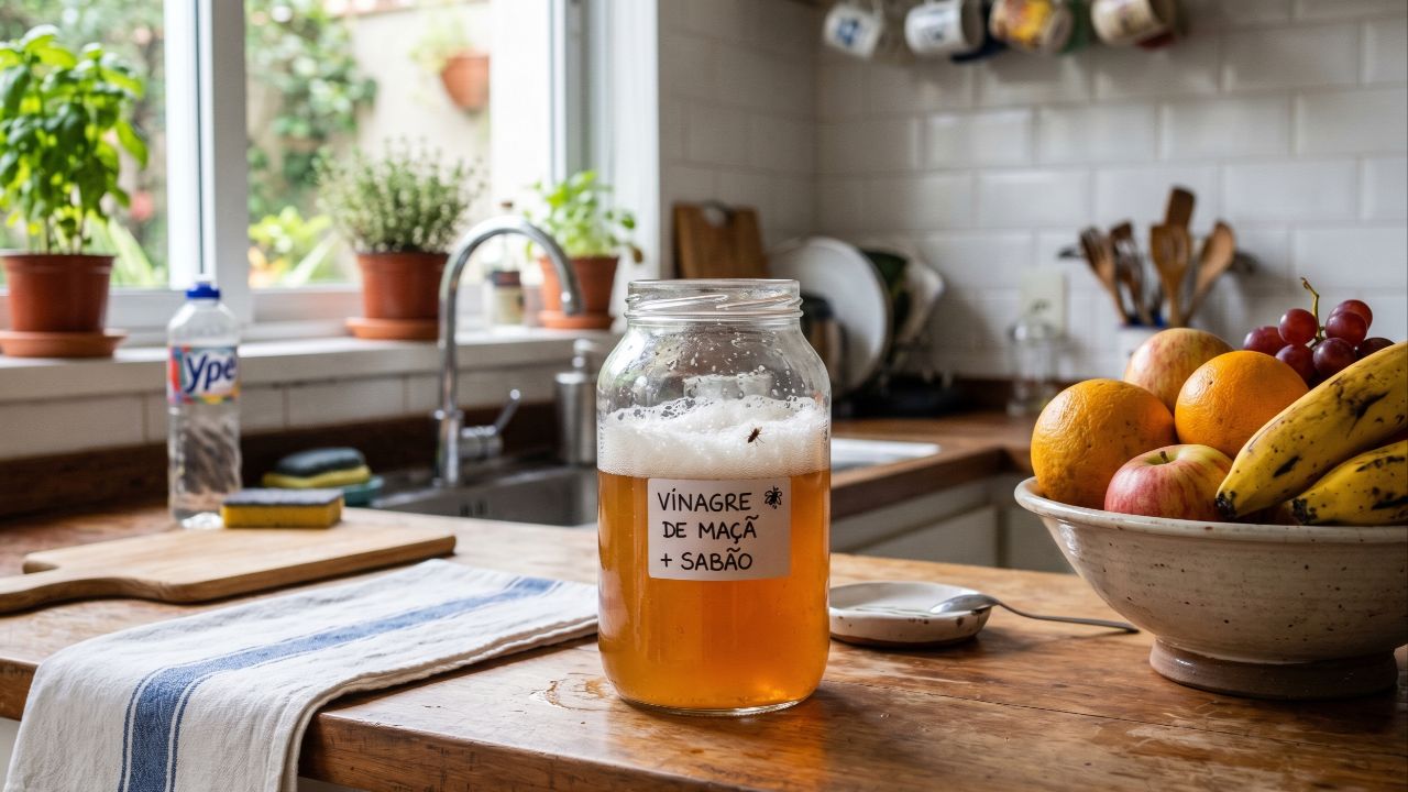 Em muitas cozinhas, a presença constante de moscas-das-frutas acaba se tornando um incômodo diário, especialmente perto de fruteira, lixeiras e pias. A mistura de vinagre de maçã e detergente se destaca como uma solução simples, econômica e acessível que ajuda a afastar esses insetos sem expor a casa a produtos químicos agressivos, mantendo o ambiente doméstico mais seguro para alimentos, crianças e animais.