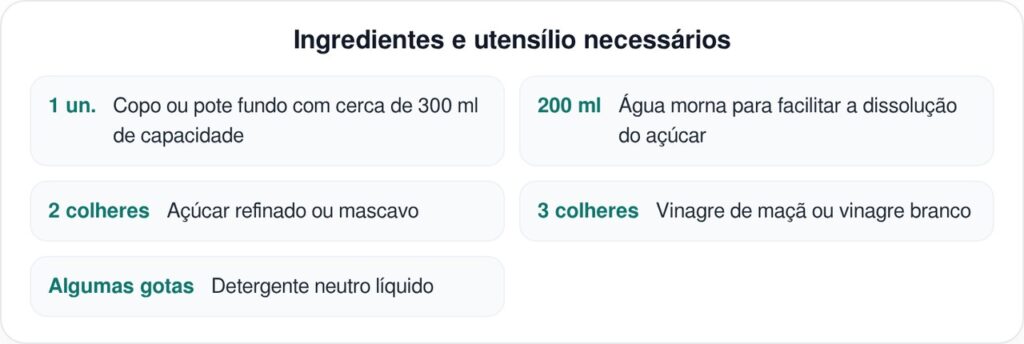 A armadilha caseira para moscas exige apenas quatro ingredientes básicos, todos fáceis de encontrar em qualquer casa. A proporção correta garante que a isca seja atrativa o suficiente e que o detergente cumpra o papel de eliminar os insetos assim que eles entram em contato com a mistura.