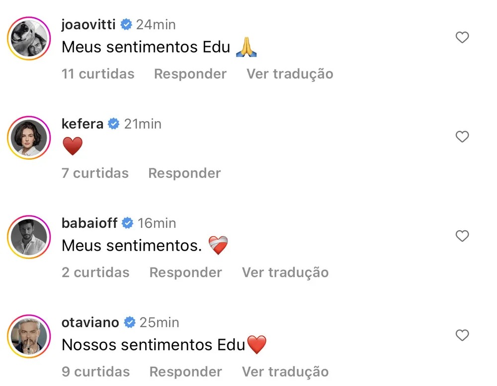Após o anúncio da morte, o artista recebeu várias mensagens de apoio e carinho de artistas e personalidades como Fátima Bernardes e João Vitti. “Meus sentimentos Edu”, escreveu o marido de Tata Werneck.
