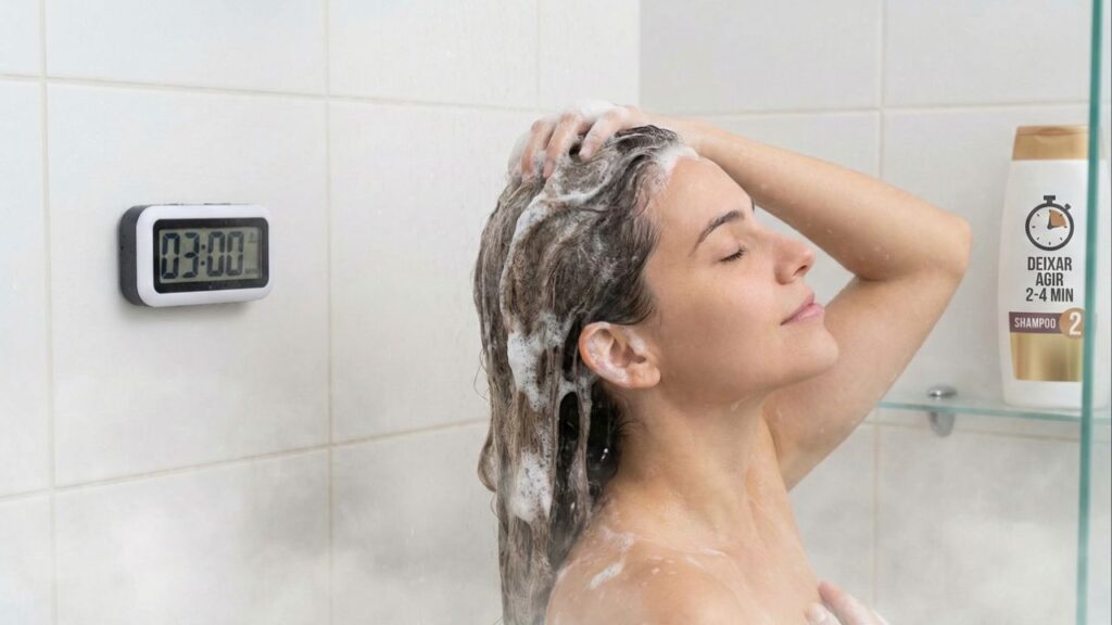 Para lavar o cabelo corretamente, o ideal é seguir as orientações da embalagem e permitir que a fórmula permaneça em contato com o couro cabeludo por um período mínimo. Em lavagens mais caprichadas, especialmente o chamado “segundo shampoo”, a permanência costuma variar de 2 a 4 minutos, conforme a recomendação do fabricante.