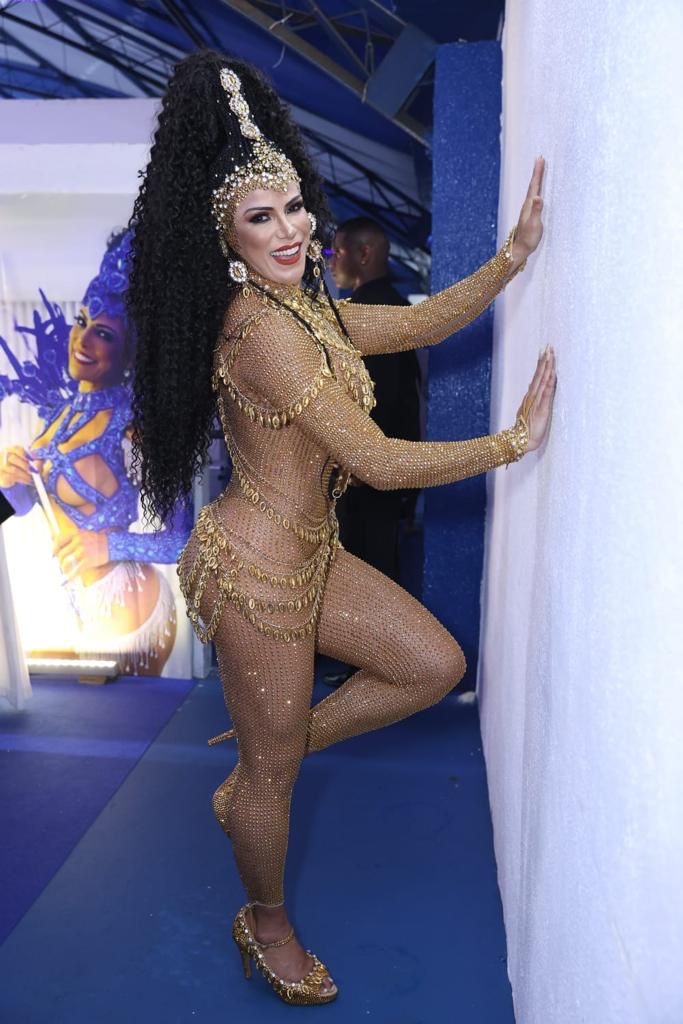 O figurino, assinado pelo estilista Guilherme Alves, foi inspirada numa Rainha Africana, e remete a nudez. Além do brilho do look, Alice esbanjou também muito samba no pé e simpatia, na noite em que também comemorou o seu aniversário, com direito a guloseimas e camarote exclusivo com decoração luxuosa, feita por Monique Rebechi, seguindo a palheta de cores da escola.