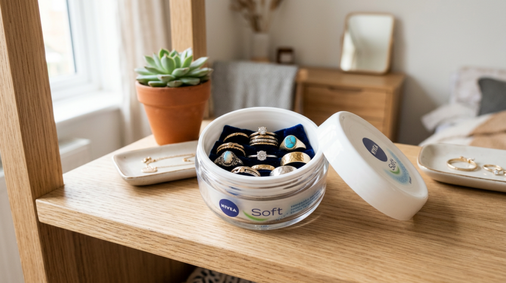 Essa é uma das ideias mais práticas e elegantes para reutilizar potes de creme, especialmente para quem viaja com frequência ou vai à academia. Depois de lavar e secar bem o potinho, coloque um pedaço pequeno de feltro, algodão ou tecido macio na base interna para criar uma camada protetora que evita arranhões nas peças. Além disso, esse detalhe simples amortece o contato entre os acessórios e mantém tudo mais organizado dentro do recipiente.