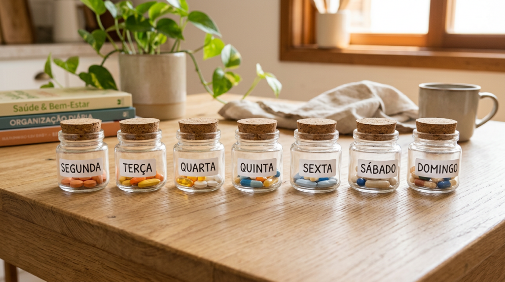 • Organizador semanal de comprimidos e suplementos, com cada potinho etiquetado por dia da semana para não esquecer a dose.