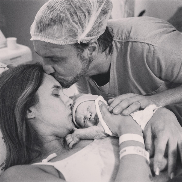 O papai babão compartilhou um lindo clique em preto e branco logo após o parto, em que aparece dando um beijo na testa de Luciana, que também beija o recém-nascido, ainda na maternidade.