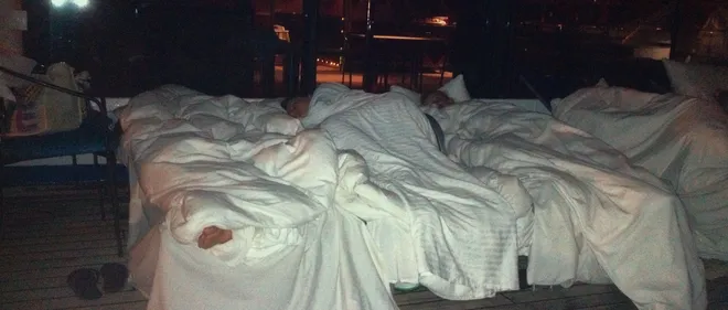 Hóspedes arrastaram colchões para os conveses abertos, tentando escapar do calor sufocante, enquanto a tripulação improvisava soluções para manter todos seguros — mesmo caminhando em água contaminada.