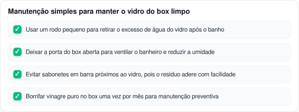 Além da limpeza semanal, alguns hábitos simples ajudam a preservar o brilho do box por mais tempo: