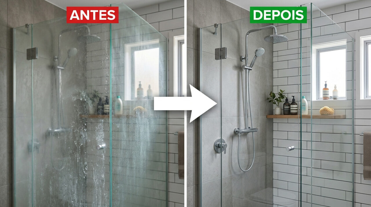 O box do banheiro é um dos pontos mais difíceis de manter limpos em toda a casa, acumulando manchas de calcário, sabão ressecado e aquela névoa esbranquiçada que parece não sair com nada. A boa notícia é que uma mistura caseira simples, feita com apenas dois ingredientes que você já tem no lar, elimina toda essa sujeira sem esforço e sem precisar esfregar o vidro com força.