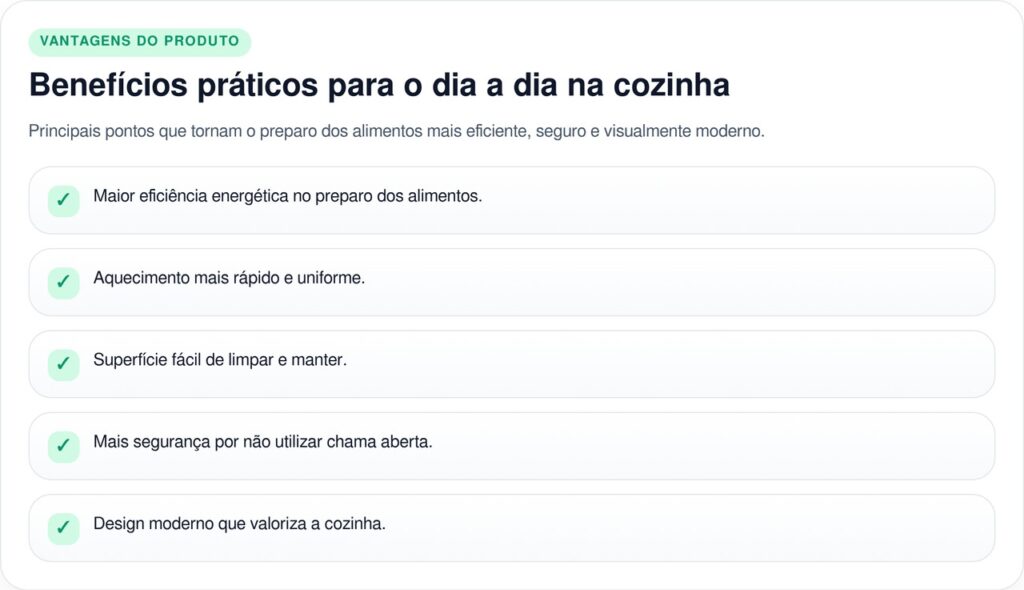 O fogão convencional depende de combustão ou resistências que nem sempre oferecem o melhor aproveitamento de energia. No contexto de casa inteligente, consumidores buscam eletrodomésticos que combinem eficiência térmica, segurança e facilidade de limpeza, características cada vez mais valorizadas no planejamento da cozinha.