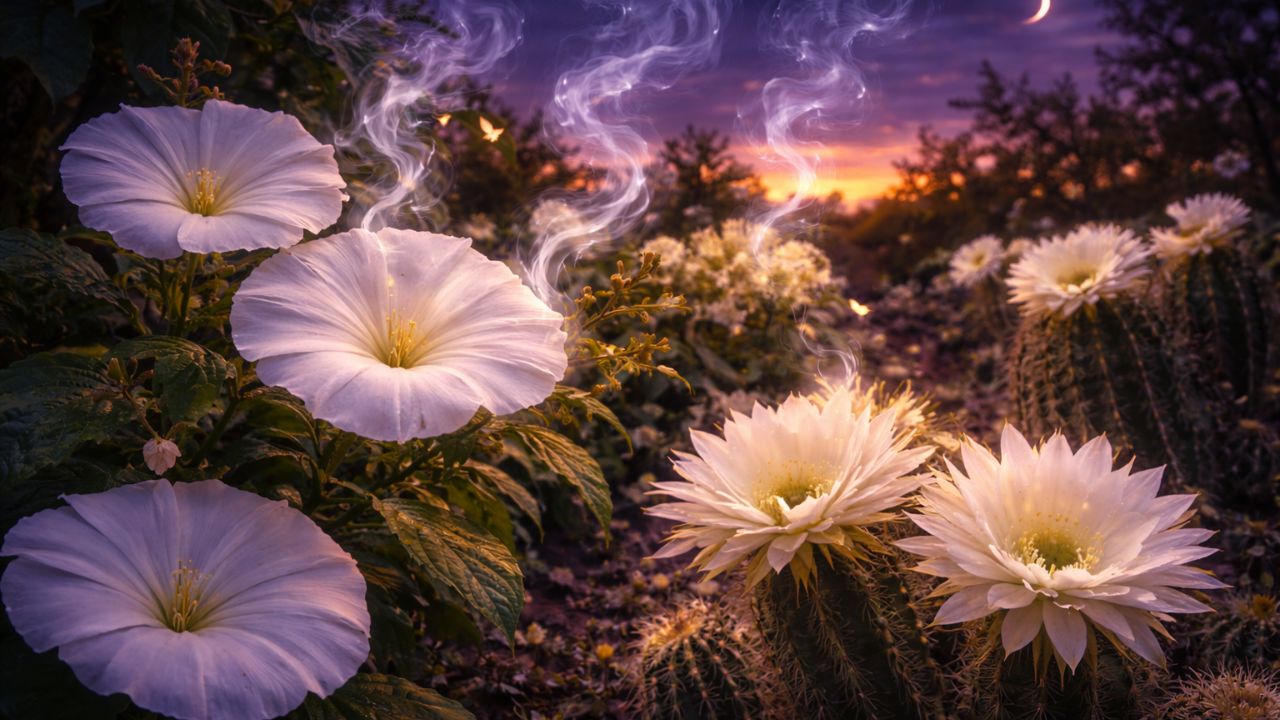 • Alguns cactos floríferos: certas espécies abrem flores por apenas uma noite, acompanhadas de perfume marcante.