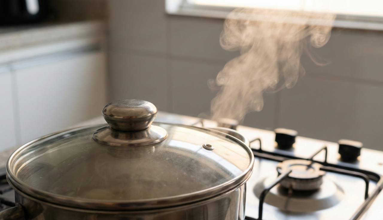 Na prática, o furo funciona como uma saída de vapor. Quando a comida ferve, o vapor se acumula e tenta escapar. Se a tampa vedar tudo, a pressão sobe, a água borbulha com mais força e a tampa pode vibrar, “dançar” ou até se deslocar de repente.