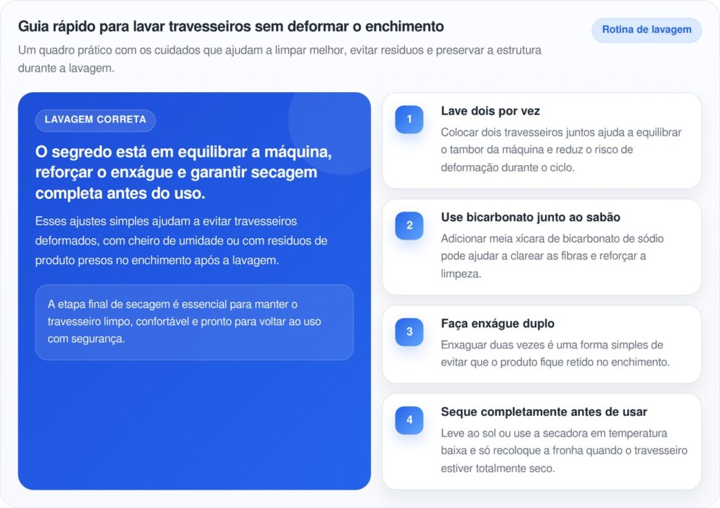 Antes de colocar o travesseiro na máquina de lavar, é essencial verificar a etiqueta de composição. Modelos com enchimento de fibra sintética costumam aceitar lavagem em máquina com água morna e sabão neutro. Já os de espuma viscoelástica ou látex não devem ser submersos, apenas limpos superficialmente com pano úmido e bicarbonato de sódio.