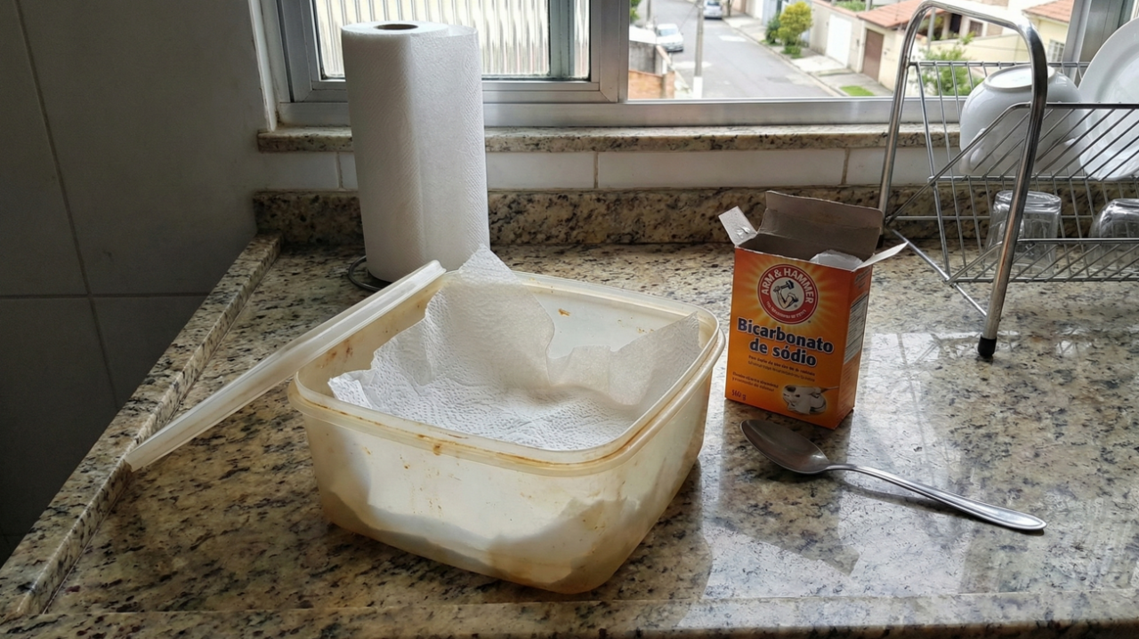 Para cheiro mais forte, o truque fica ainda melhor com uma versão reforçada: umedeça levemente o papel com uma solução de bicarbonato de sódio e deixe a vasilha fechada por uma noite. No dia seguinte, o cheiro costuma reduzir bastante, sem precisar jogar o pote fora.