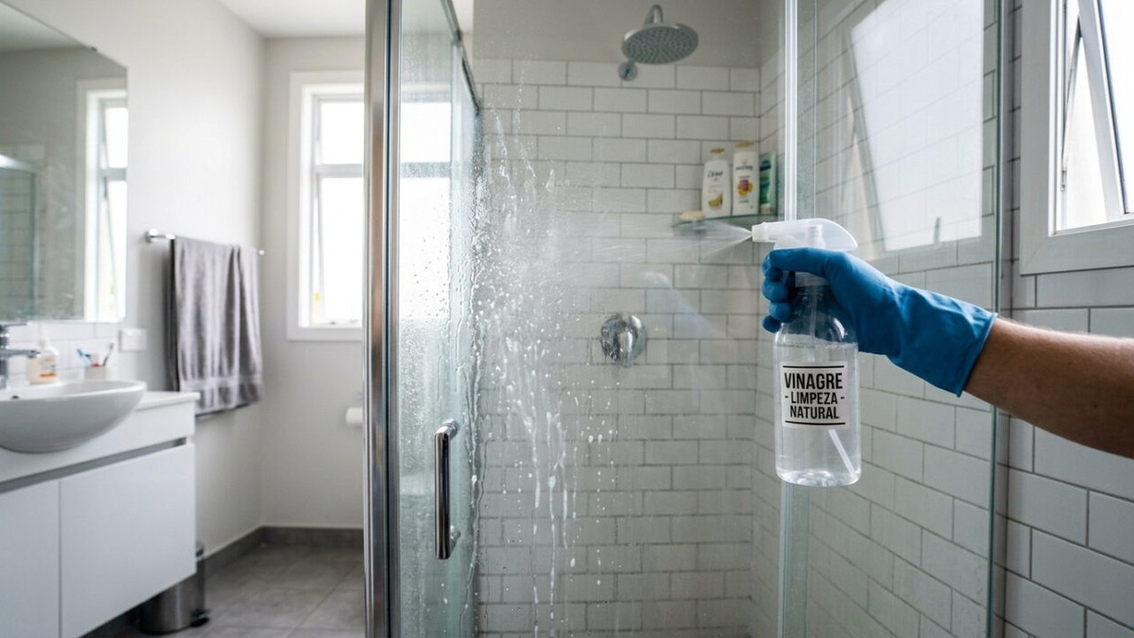 Mão com luva azul borrifa vinagre em box de vidro. Rótulo: VINAGRE - LIMPEZA NATURAL.
