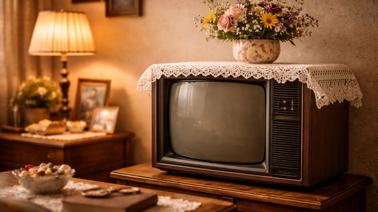 A toalhinha sobre a televisão, muitas vezes de crochê ou bordado, era um dos objetos mais emblemáticos da decoração caseira das décadas de 1980 e 1990. Esse item tinha uma função prática: servir de barreira contra poeira, arranhões e até contra o calor do aparelho, em uma época em que a TV era um bem caro e central na casa.