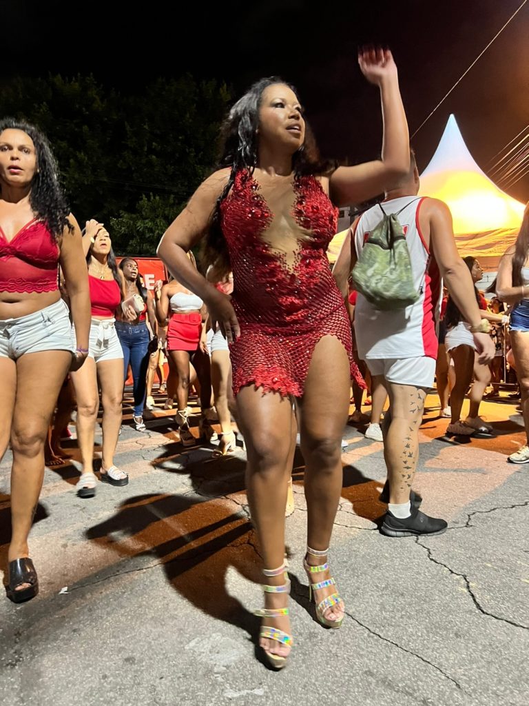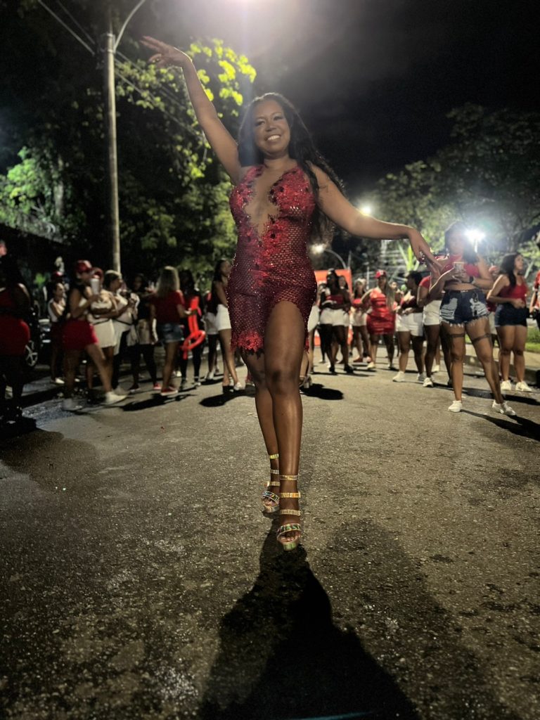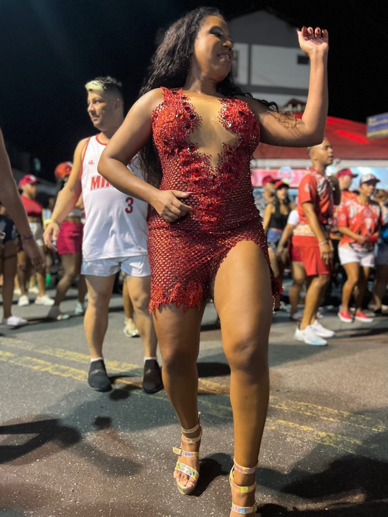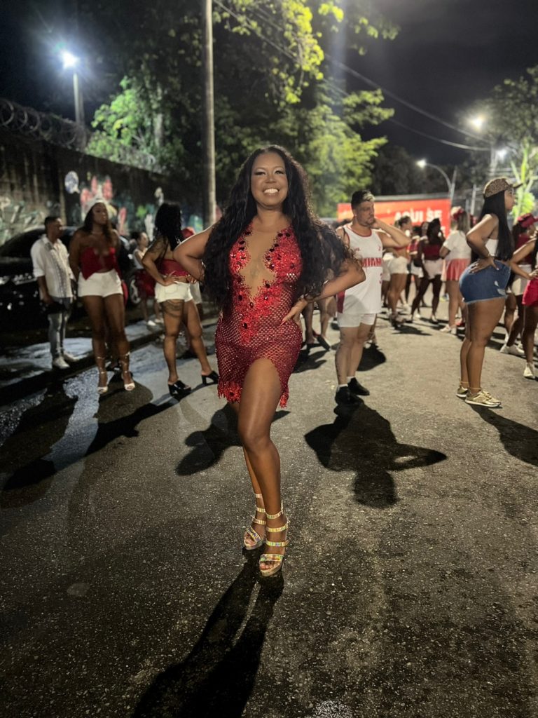 Nem a chuva intimidou a empresária Elis de Sá, musa da Unidos de Padre Miguel, que surgiu na noite da última sexta-feira (13), no ensaio de rua com um vestido curto na cor vermelha, transparente com uma fenda nas pernas em Padre Miguel, Zona Oeste do Rio: