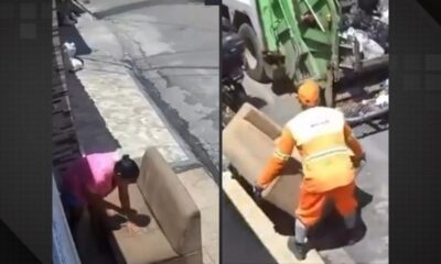 Uma câmera de segurança flagrou o momento em que uma moradora de Maceió (AL) teve o sofá levado por garis após deixar o móvel do lado...