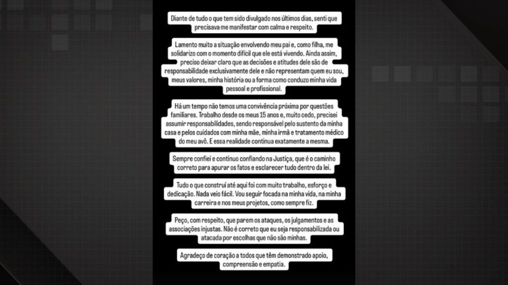A influenciadora se pronunciou sobre a prisão do pai e afirmou que as atitudes dele são de responsabilidade exclusiva dele e não refletem seus valores ou sua trajetória pessoal e profissional. Ela destacou que não mantém convivência próxima com o pai há algum tempo por questões familiares e reforçou que sempre trabalhou e construiu sua carreira com esforço próprio.