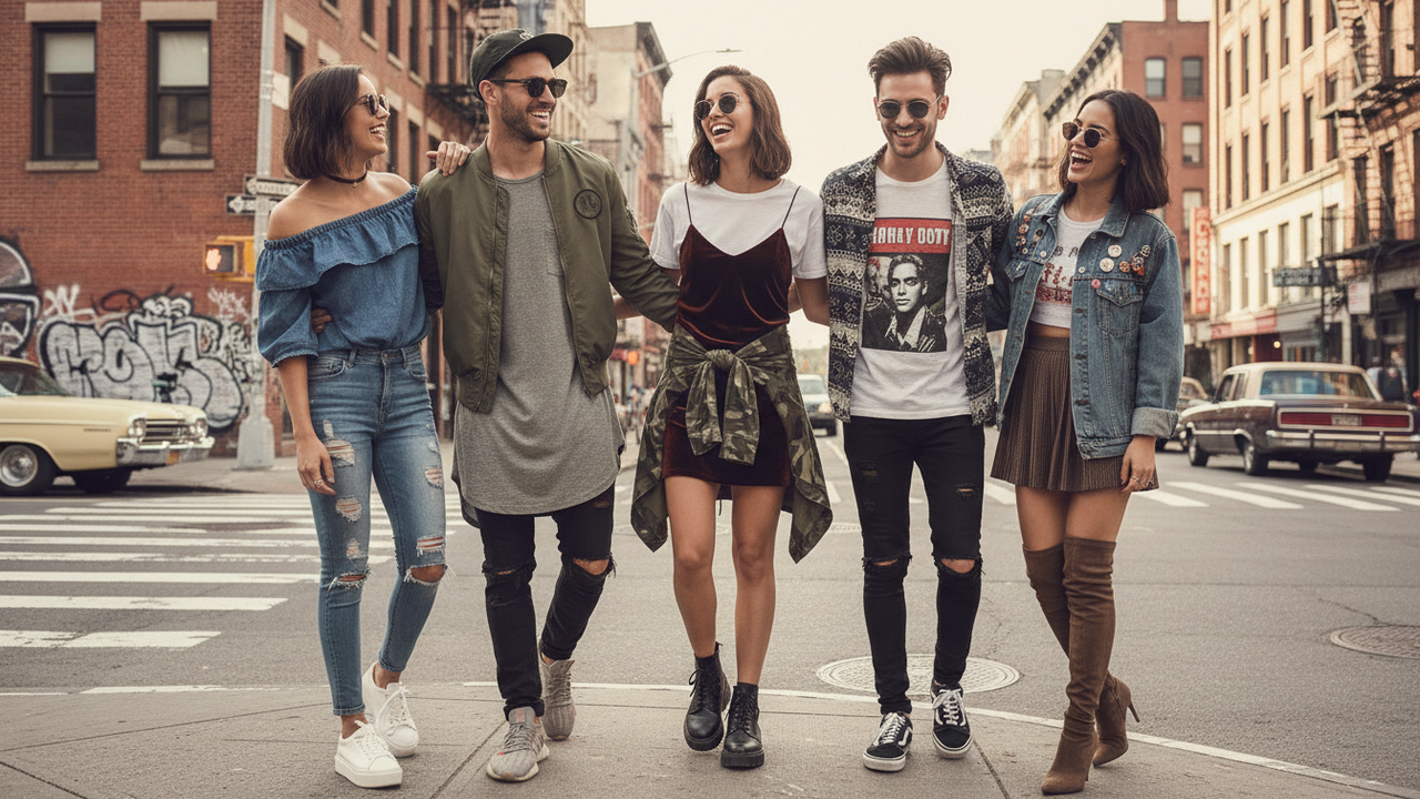 - Peças marcantes: jeans skinny, tops curtos, jaquetas bomber, chokers.