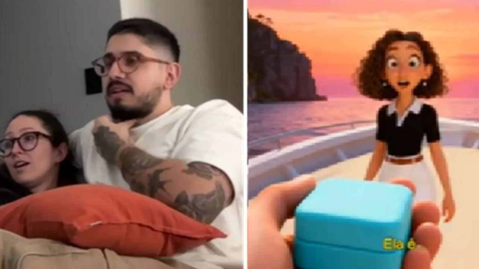 Na sequência final, a animação dá lugar à cena real. Sentados no sofá de casa, Marcelo aparece com uma caixinha de anel, e Jess se emociona. “Que vídeo lindo”, disse ela antes de aceitar o pedido.