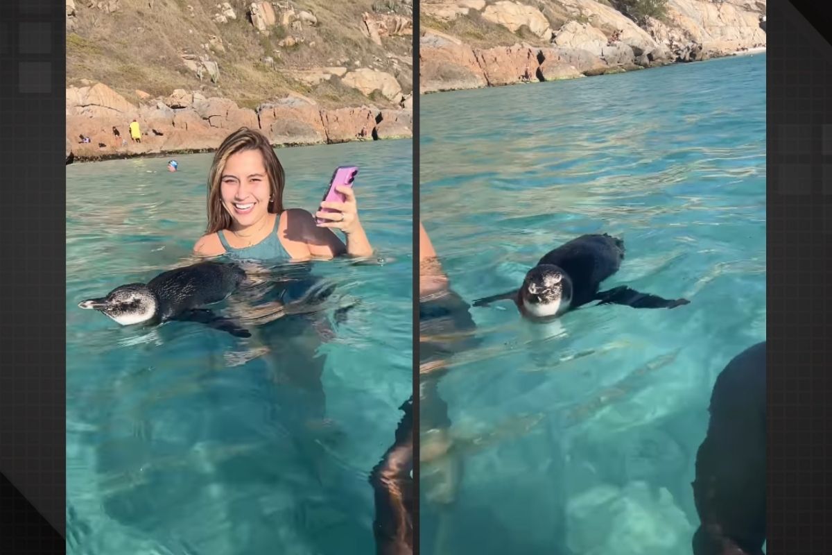 Pinguim nada entre casal em Arraial do Cabo e vídeo viraliza na web