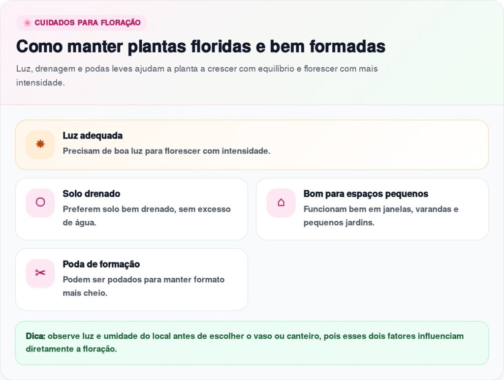 Para manter gerânios, lantanas e girassóis anões bonitos, o jardim precisa de três cuidados básicos: sol, drenagem e rega bem ajustada. Sol em excesso não é problema para essas espécies, mas solo seco demais por vários dias pode derrubar flores e enfraquecer folhas.