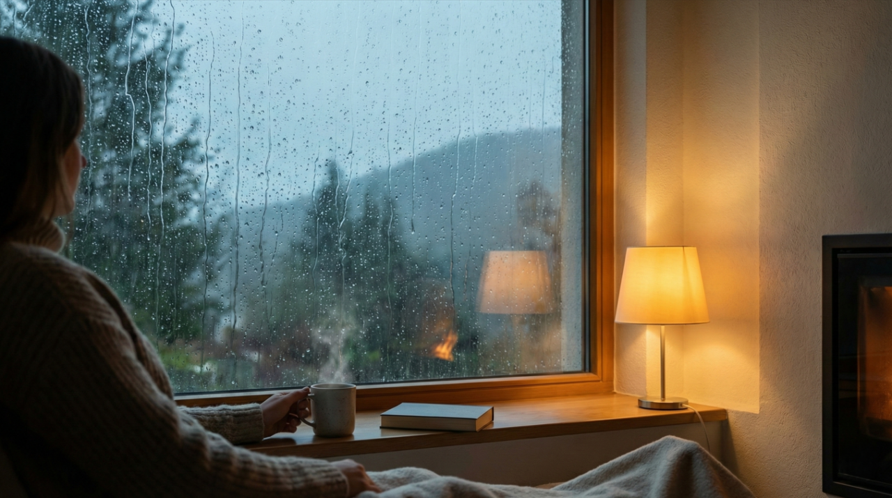 A chuva ativa uma ideia quase instintiva de abrigo. Estar dentro de casa enquanto o mundo desacelera do lado de fora desperta sensação de proteção e refúgio.