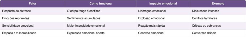 Esses fatores mostram que o choro em discussões está frequentemente ligado à forma como cada pessoa processa emoções e situações de tensão.