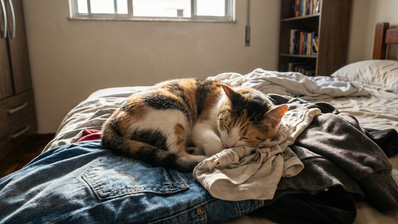 Quando o gato se estica nas suas roupas, o recado geralmente é positivo. Em termos de comportamento felino, isso pode significar busca de segurança, vontade de ficar perto de você e preferência por pontos previsíveis da casa. É o tipo de escolha que aparece muito em animais que se sentem parte do ambiente.