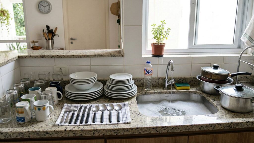 - Separar a louça em grupos: copos, talheres, pratos, panelas e utensílios de preparo.