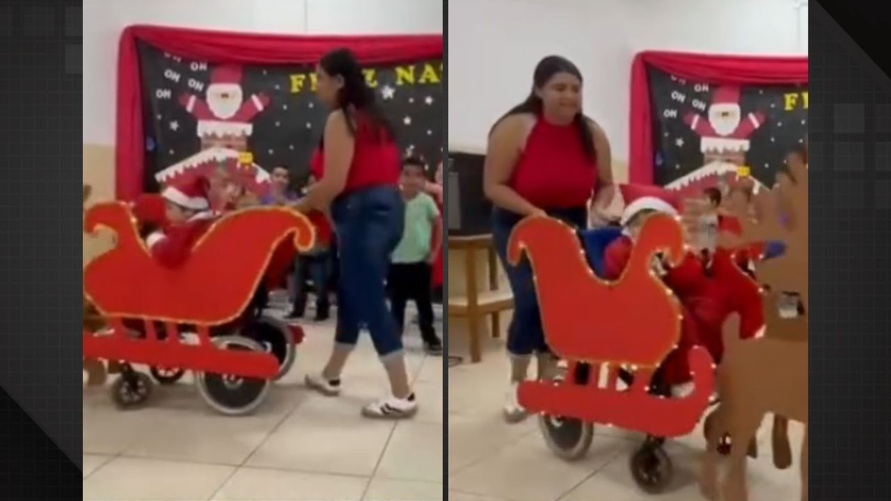 Professoras transformam cadeira de rodas em trenó para aluno em apresentação de escola