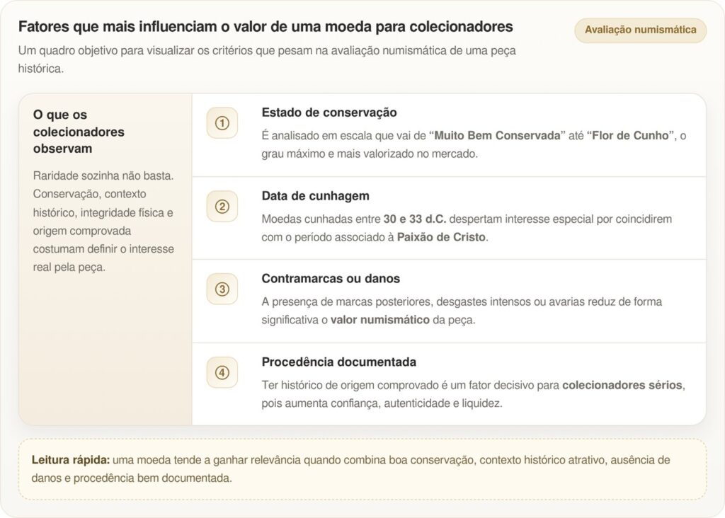 Não há como rastrear as 30 moedas específicas que teriam passado pelas mãos de Judas. Na Idade Média, diversas relíquias foram veneradas como supostas “moedas da traição”, mas nenhuma resistiu à verificação histórica. O que existe, e em quantidade razoável, são exemplares de siclos de Tiro do mesmo período. No mercado numismático, um único siclo de Tiro em bom estado de conservação pode ser vendido por valores que chegam a R$ 20.000, dependendo da raridade e do grau de preservação dos detalhes.