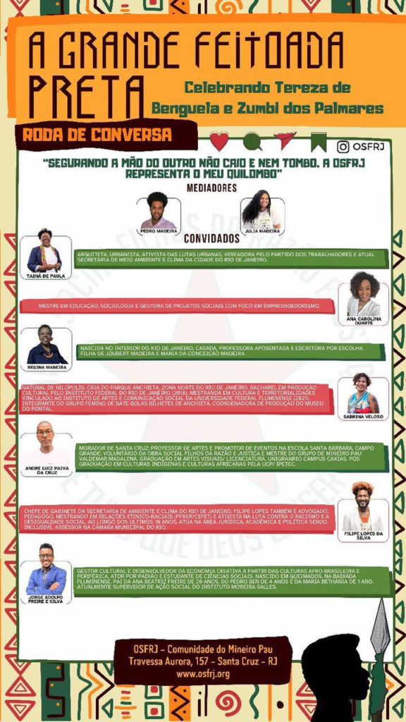 - 10h – Roda de Conversa com o tema: “Segurando a mão do outro não caio e nem tombo. A OSFRJ representa o meu quilombo”