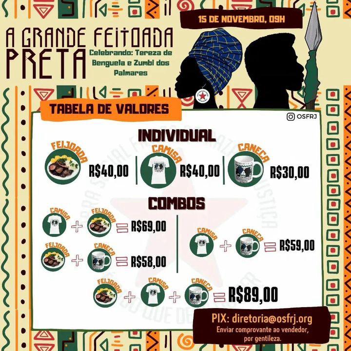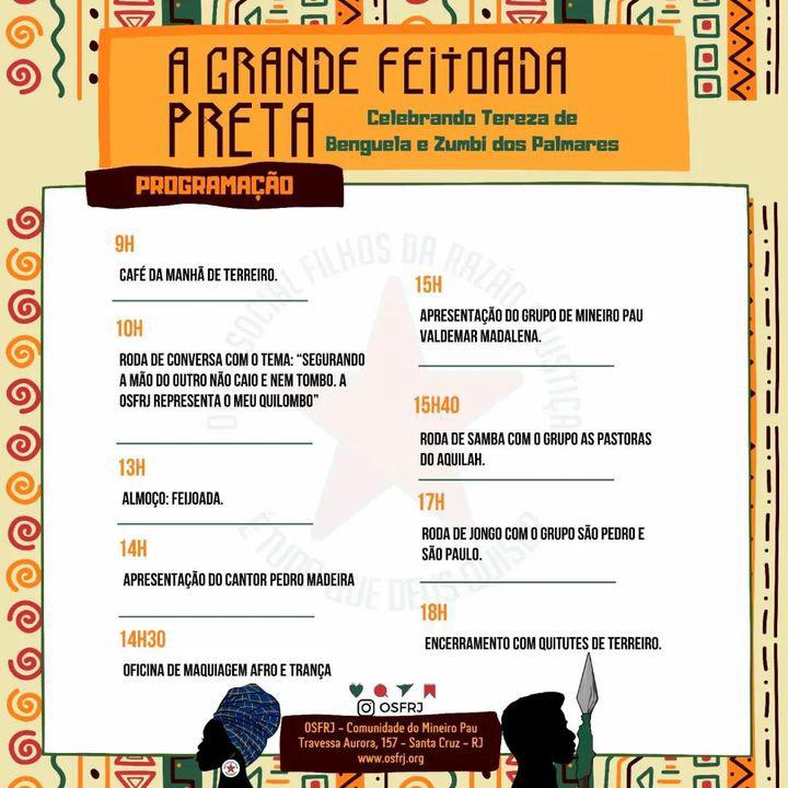O Quilombo OSFRJ, em Santa Cruz, na Zona Oeste do Rio, realiza nesta quarta-feira (15) a Grande Feijoada Preta: Celebrando Tereza de Benguela e Zumbi dos Palmares.