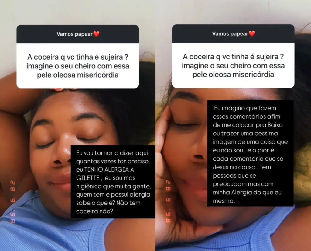 Raquel respondeu sem hesitar: “Eu vou tornar a dizer aqui quantas vezes for preciso, tenho alergia a Gillete. Sou mais higiênica que muita gente, quem tem alergia sabe o que é. Não tem coceira, não?”, rebateu a influenciadora, dirigindo-se diretamente à seguidora.