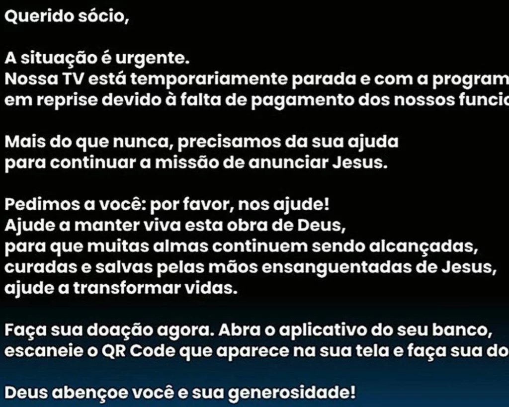“A situação é urgente. Nossa TV está temporariamente parada e com a programação em reprise devido à falta de pagamento dos nossos funcionários. Pedimos a você: por favor, nos ajude! Ajude a manter viva esta obra de Deus”, pontua um trecho do comunicado.