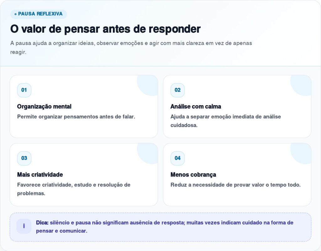 O silêncio cria espaço para reflexão. Quando não há pressa para responder, a mente consegue revisar ideias, questionar certezas e encontrar relações mais complexas entre os fatos. Esse tempo interno ajuda a evitar respostas automáticas e decisões impulsivas.