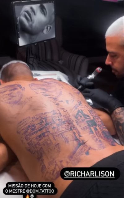 O atacante Richarlison, camisa 9 da seleção brasileira na Copa do Mundo do Catar, resolveu homenagear três grandes ídolos nesta terça-feira (13). Ele está fazendo uma tatuagem gigante nas costas com o desenho de Ronaldo Fenômeno, Neymar e uma mensagem enviada por Pelé.