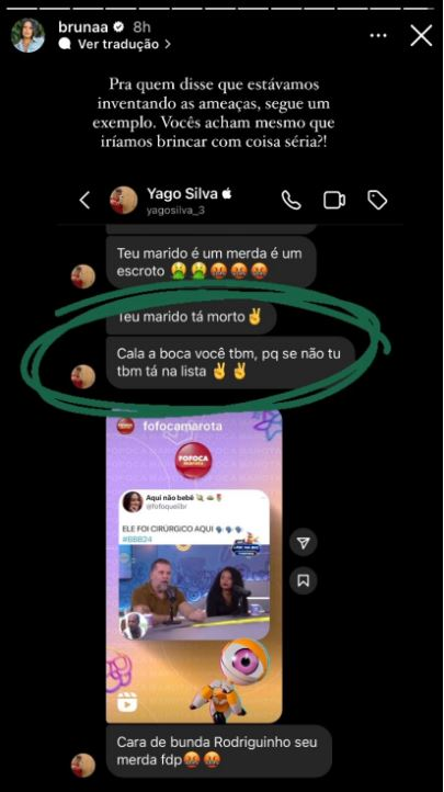 Além desse momento, Bruna também expôs que está recebendo ameaças online. A equipe do cantor já havia publicado oficialmente que repudia qualquer tipo de ameaça ou ofensa feita contra Rodriguinho e sua família.