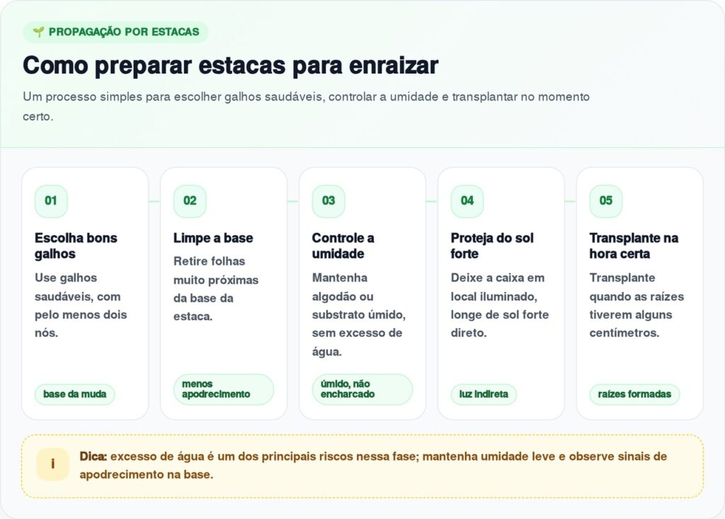 Para esse método, o mais importante é manter umidade sem apodrecer o material. A base da estaca pode ficar apoiada em algodão úmido ou em um pouco de substrato leve. O processo pede observação diária: