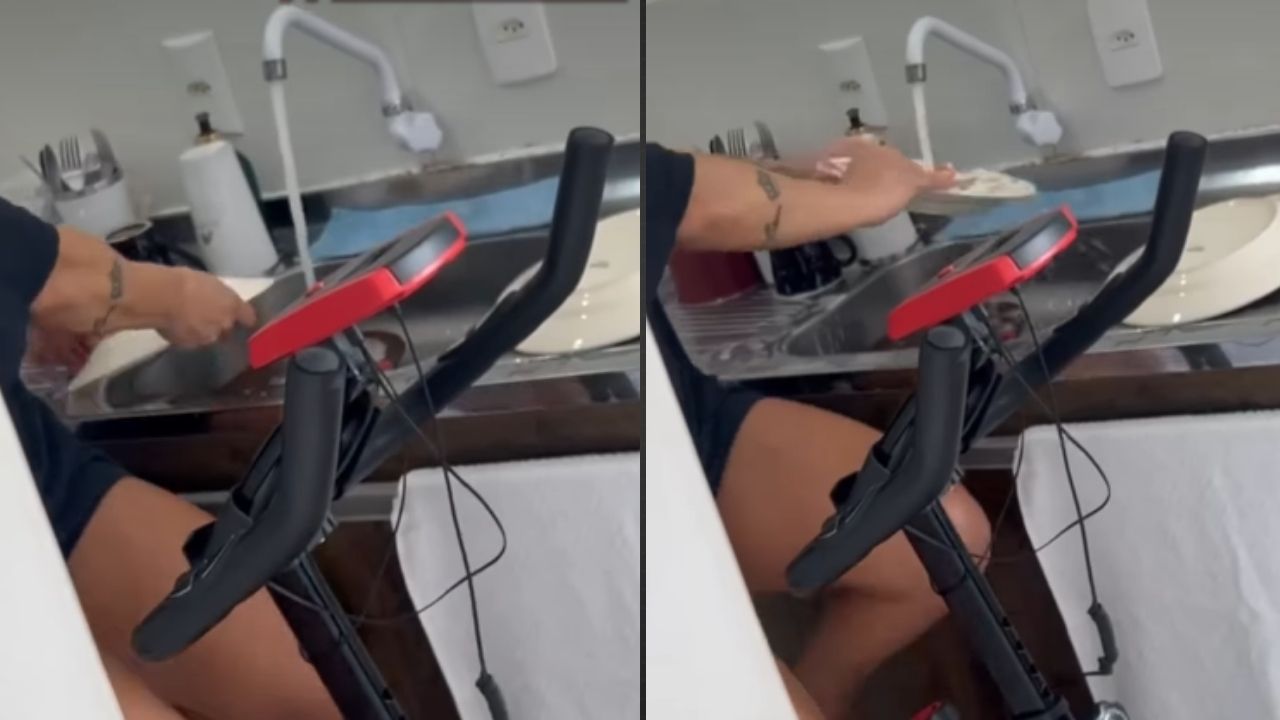Sem desculpas: mulher pedala enquanto lava louça, e vídeo do marido viraliza: “Vou aderir”