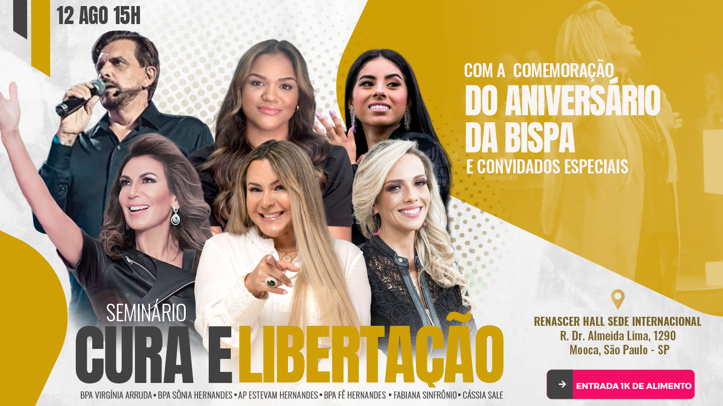 Acontece neste sábado (12), a partir das 15h, o Seminário de Cura e Libertação no Renascer Hall, sede internacional da Igreja Renascer em Cristo, na Zona Leste de São Paulo.