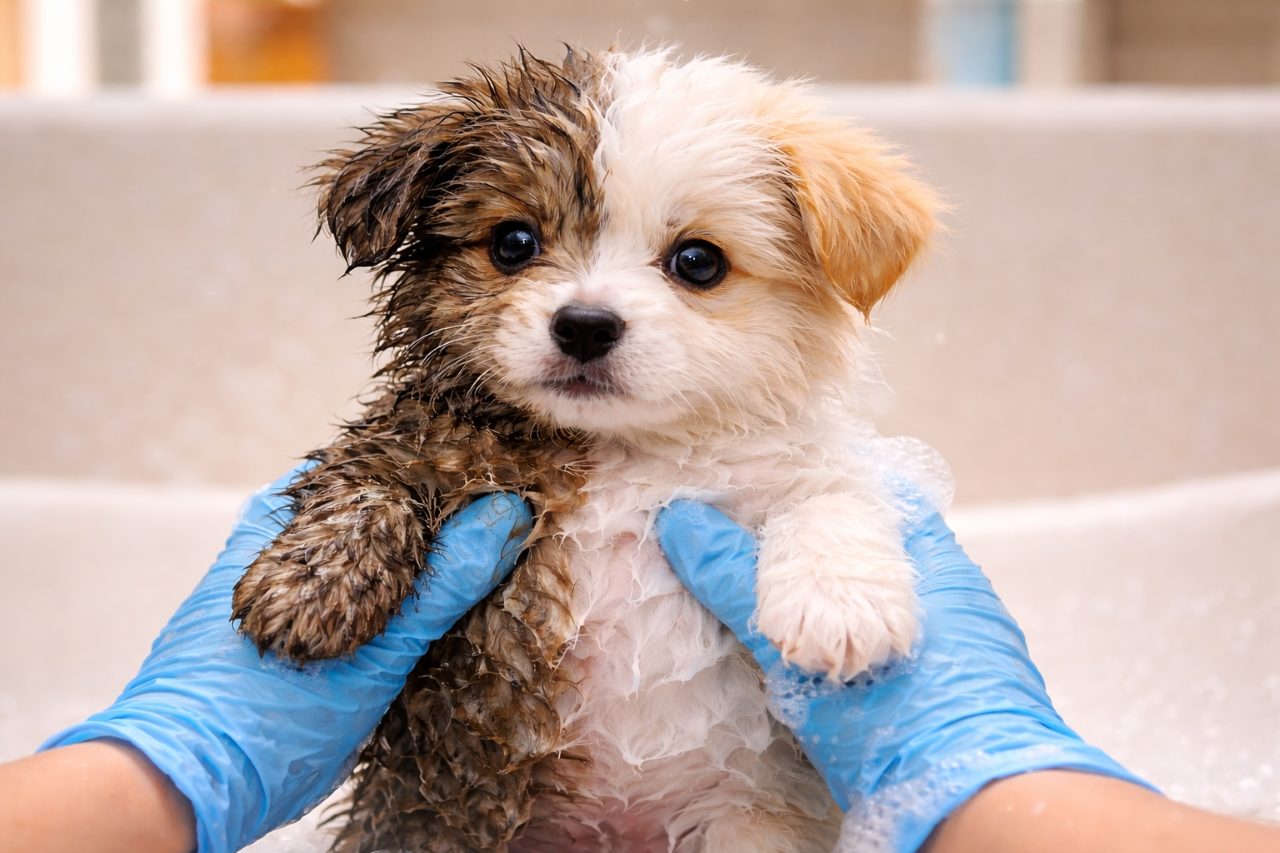 Filhote surpreende ao mostrar pelagem real após sair da sujeira