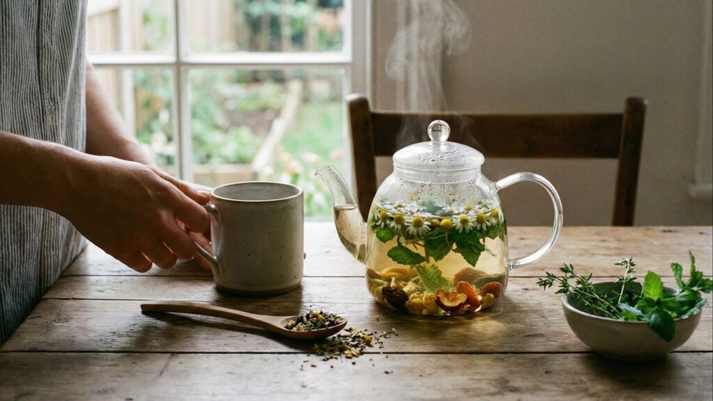 O próprio tempo de preparo — ferver a água, escolher as ervas, aguardar a infusão — funciona como pausa estruturada, que sinaliza ao cérebro um início de dia mais gradual. Aromas como camomila, hortelã ou capim-limão ajudam a modular o estresse e favorecer sensação de calma.