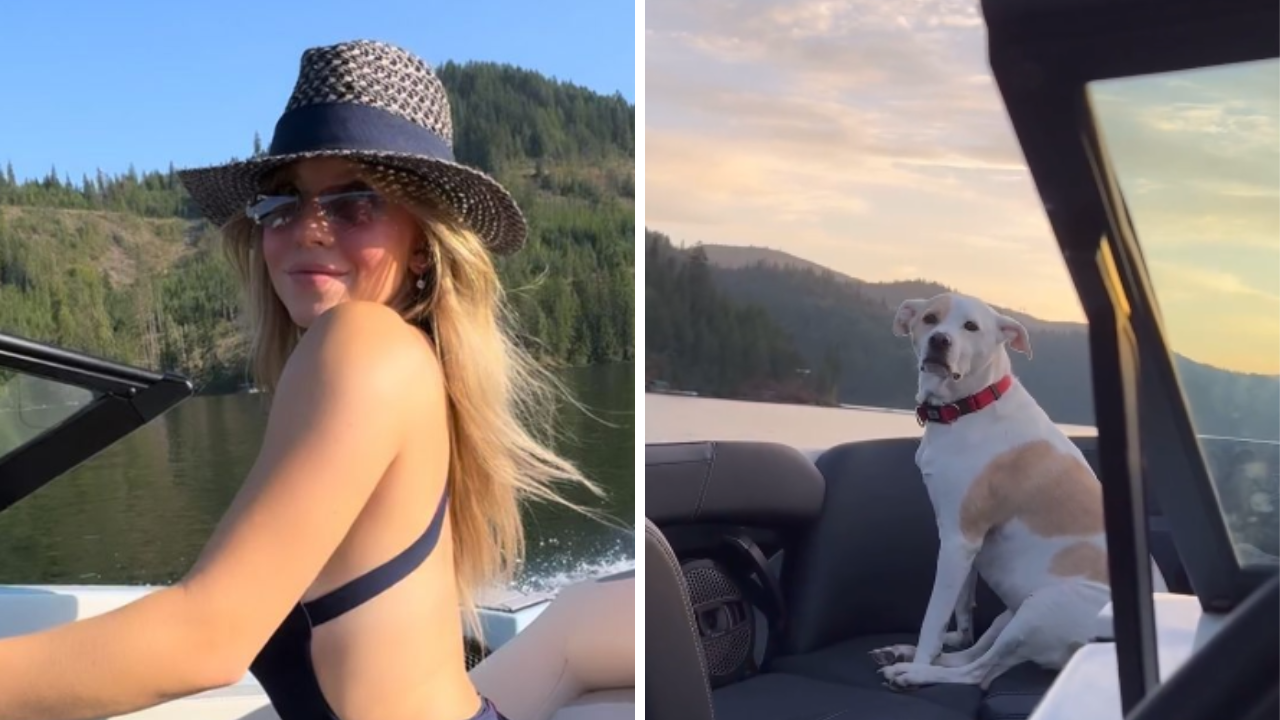 Sydney Sweeney aparece de maiô cavado em passeio de lancha com pet