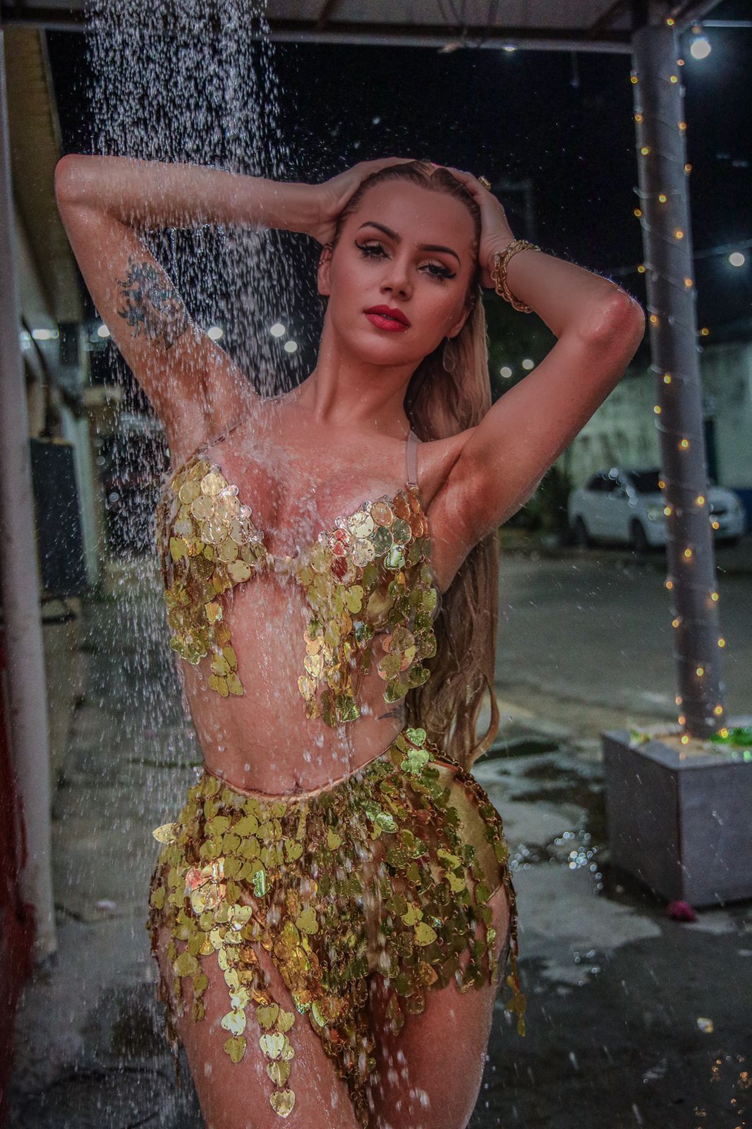 Para ocasião, a beldade escolheu um look fresco para sambar do início ao fim do ensaio. Mas com a sensação térmica chegando quase na casa dos 60° graus, pós ensaio a rainha precisou se refrescar tomando banho de chuveiro em uma das ruas da comunidade
