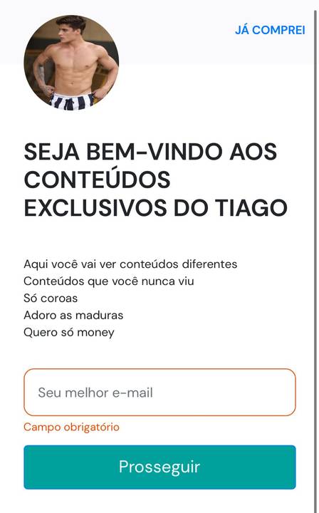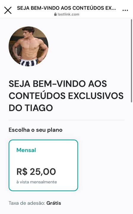 Tiago abriu conta em duas plataformas de conteúdo adulto. Em uma delas, ele está cobrando 10 dólares mensais, cerca de R$ 47 reais, para quem quiser ter acesso aos seus vídeos e fotos peladão.